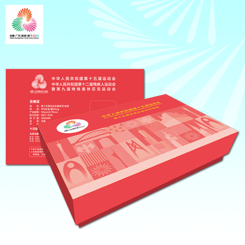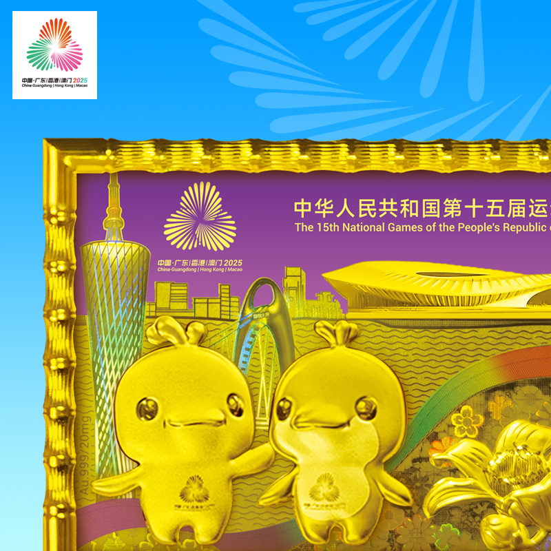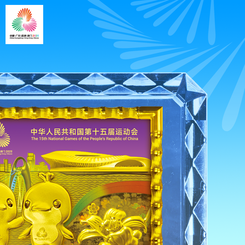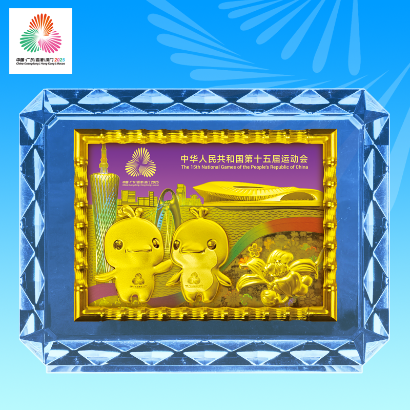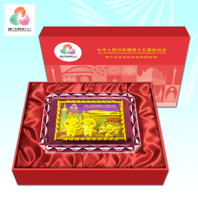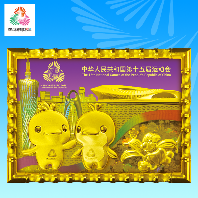 此款3D金版图案以“中华人民共和国第十五届运动会”的会徽、中英文全称、吉祥物和广州塔、猎德大桥、南沙全民文化体育中心等建筑、结合广州市市花(木棉花)及波浪等进行构图设计。吉祥物、木棉花及南沙全民文化体育中心为3D浮雕工艺、其他的为电铸金版、激光微雕、3D浮雕模压、全息光变工艺。