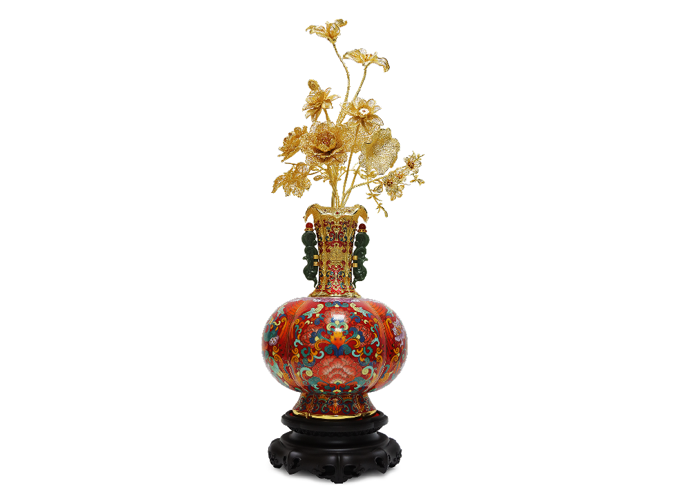 《福运中国·金花瓶》以中国传统经典器型设计,融合祖国与粤港澳大湾区吉祥花卉为主题创作,献礼2025年广州、香港、澳门共同举办的第十五届全运会。作品融合非遗景泰蓝、花丝镶嵌、玉雕、铜錾刻、宝石工艺镶嵌、珐琅彩绘等传统技艺呈现,整体缀以56颗璀璨星辰,如星耀华夏、辉映盛世,堪称“六艺合一”的时代重器,象征祖国团结繁荣,共襄此届全运会盛举。